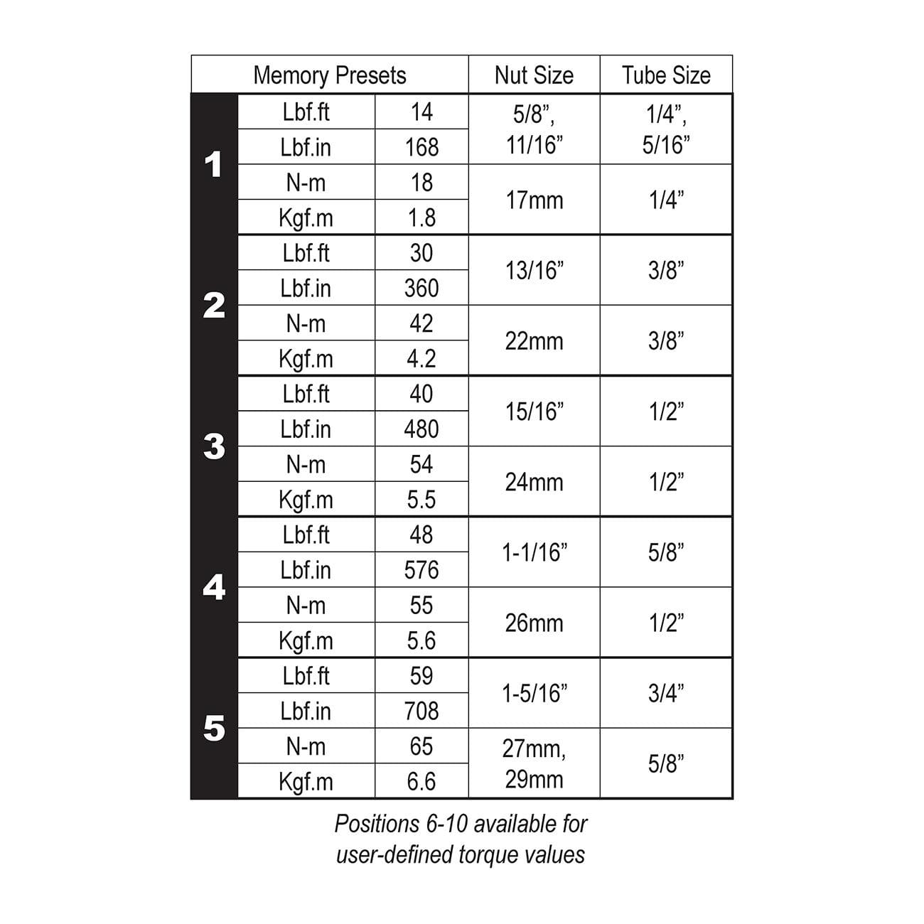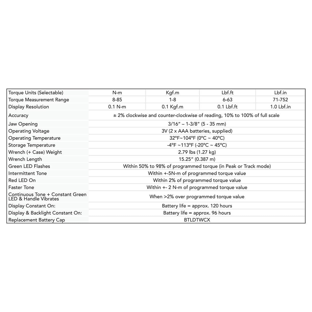 The BTLDTW Digital Torque Wrench stores 1-5 factory and 6-10 user-defined presets, and is able to simultaneously display stored vs. actual torque values. Large display numbers prevent misreading torque data, a common problem when using non-adjustable, non-digital torque wrenches. View “Peak” and “Track” torque data with audible (tone), visual (LED) and tactile (vibration) “torque alerts” to prevent over-tightening by providing advance warning when approaching or exceeding predefined torque settings.