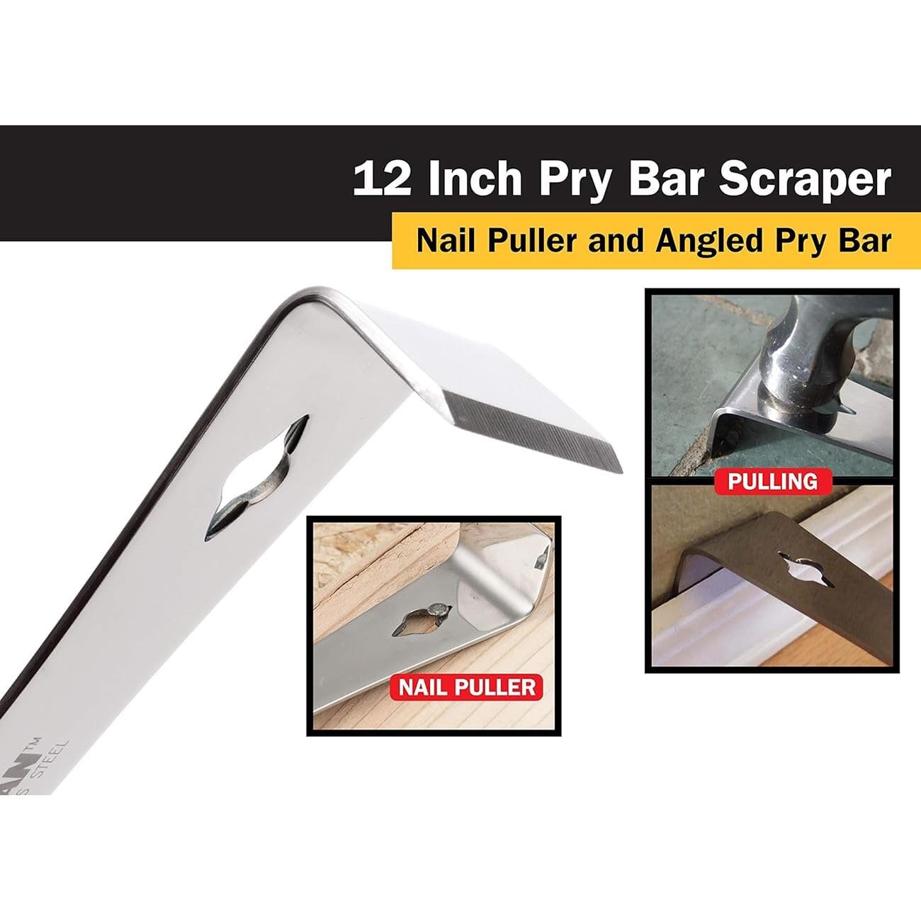 • Nail puller, razor sharp scraper edge, and an angled edge for pulling and prying